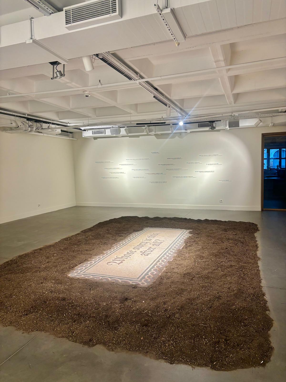 O gün keyfim daha çok çizilen tabloların karşısına geçip, kendince kılıf uydurmak istediği için hiç girmeyip çıkabilirdim oradan ama yapmadım. Çünkü Esra ve Cengiz’in bahsettiği parçalanmış ama canlı mozaik tam da önümde, zemini kaplamış yerde, öylece duruyordu. Yanına yaklaşıp baktığımda üstünde serginin merkezine aldığı “sonuçta bu kimin hikayesi?” yazıyordu. Onu çevreleyen şey ise topraktı. Girişteki o cümle geldi aklıma; “Toprak sadece insanın değil, tüm varlıkların belleğidir. Başlangıcın ve kalıntının, doğumun ve çürümenin ortak mekânı…”